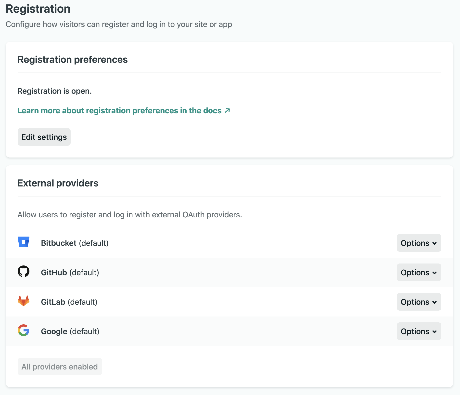 Once you’ve pushed your project live to Netlify, you can go to your app’s Identity Settings where you can add as many auth providers as you’d like, limit registration, add CMS settings, and customize emails sent to your users.