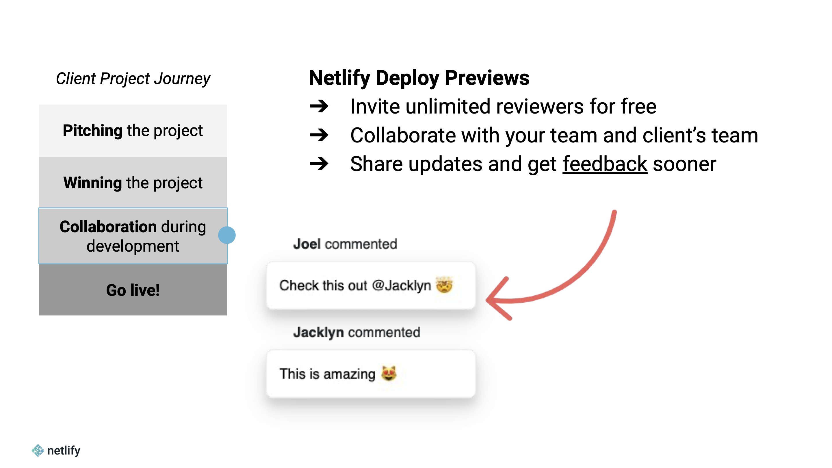 Netlify recently announced the launch of collaborative Deploy Previews, which enables users to share, review, and manage feedback on web projects. Packed full of handy tools for reviewers to record their screen, take screenshots, or open the preview on a mobile device to test mobile responsiveness and even use the collaborative features on mobile devices. For now, collaborative Deploy Previews are only supported for GitHub organizations, but GitLab support is coming soon!