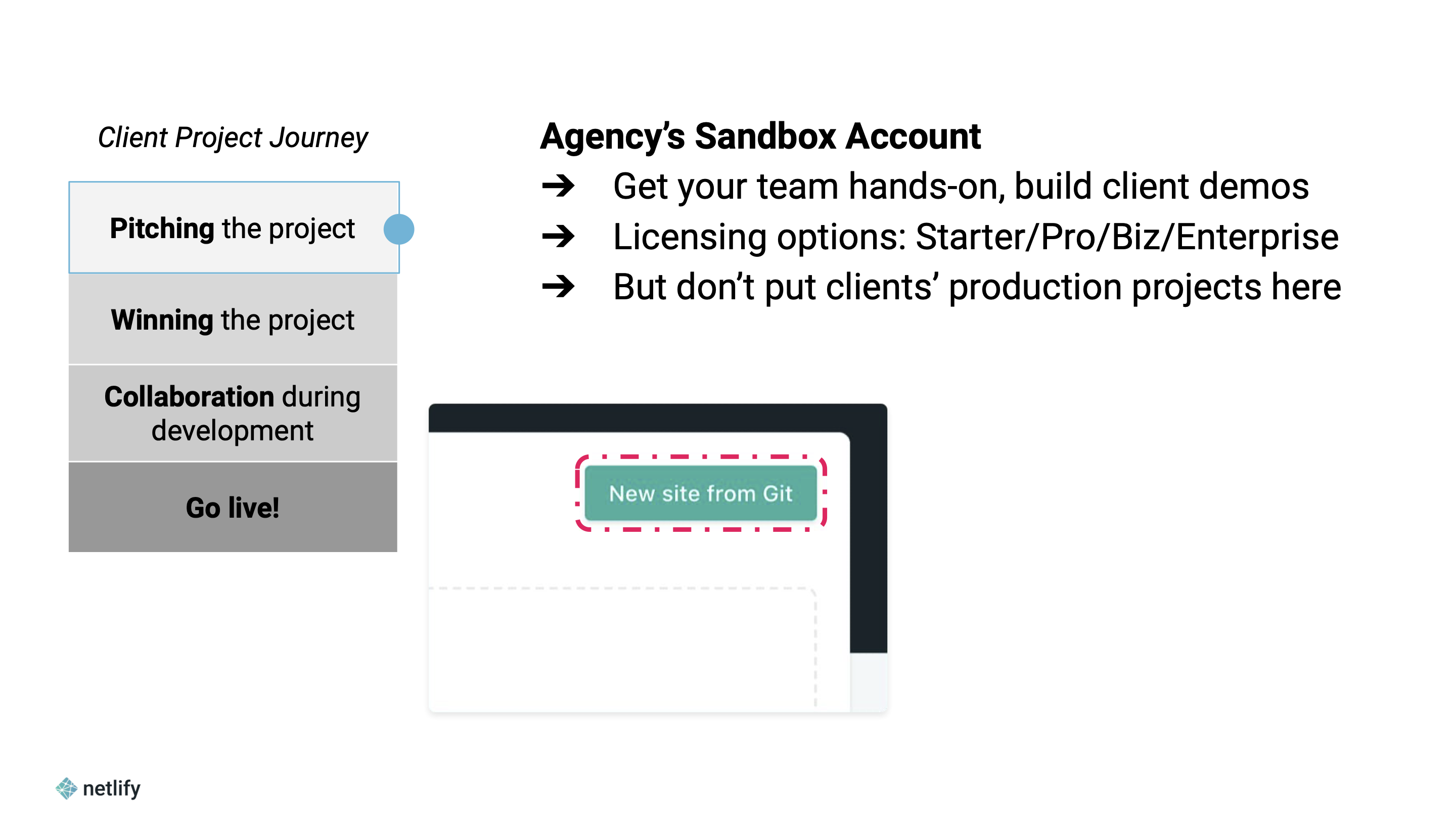 To help clients understand what to expect when hosting with Netlify, we recommend agency partners set up their own Netlify agency account. That’s where you can build proofs-of-concept and demos for the clients you are pitching.