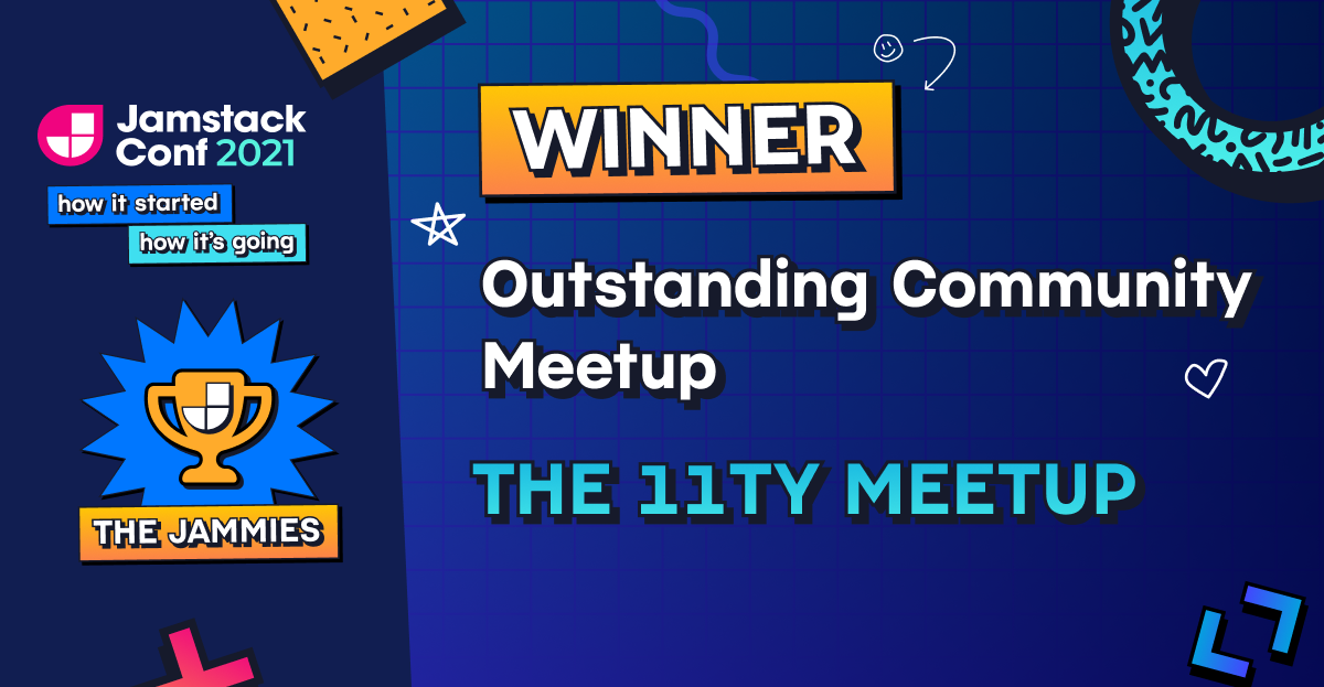 Today, this year’s award went to The 11ty Meetup! The 11ty meetup group is a virtual meetup about Eleventy and the tools and skills that support developing on Eleventy. Oh, and they’re welcoming to everyone so feel free to join this group if you’re looking for more Jamstack communities to participate in.