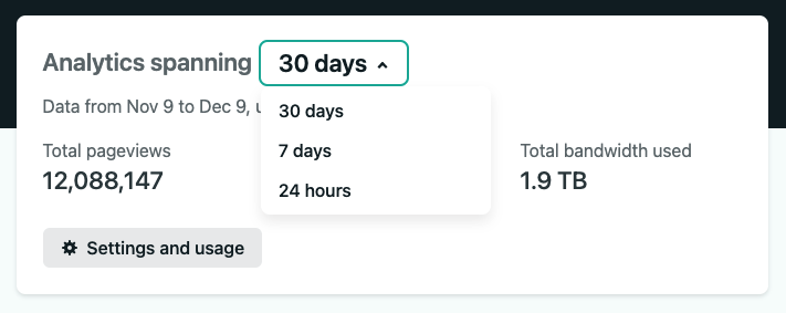 By default, the charts show data for the past 30 days, and you can switch between different time periods by using the filters in the header card.