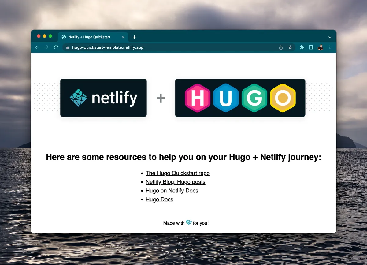 netlify sites:create-template hugo-quickstartwhich will create a repo, Netlify project, and deploy it - If you want to utilize continuous deployment through GitHub webhooks, run the Netlify command