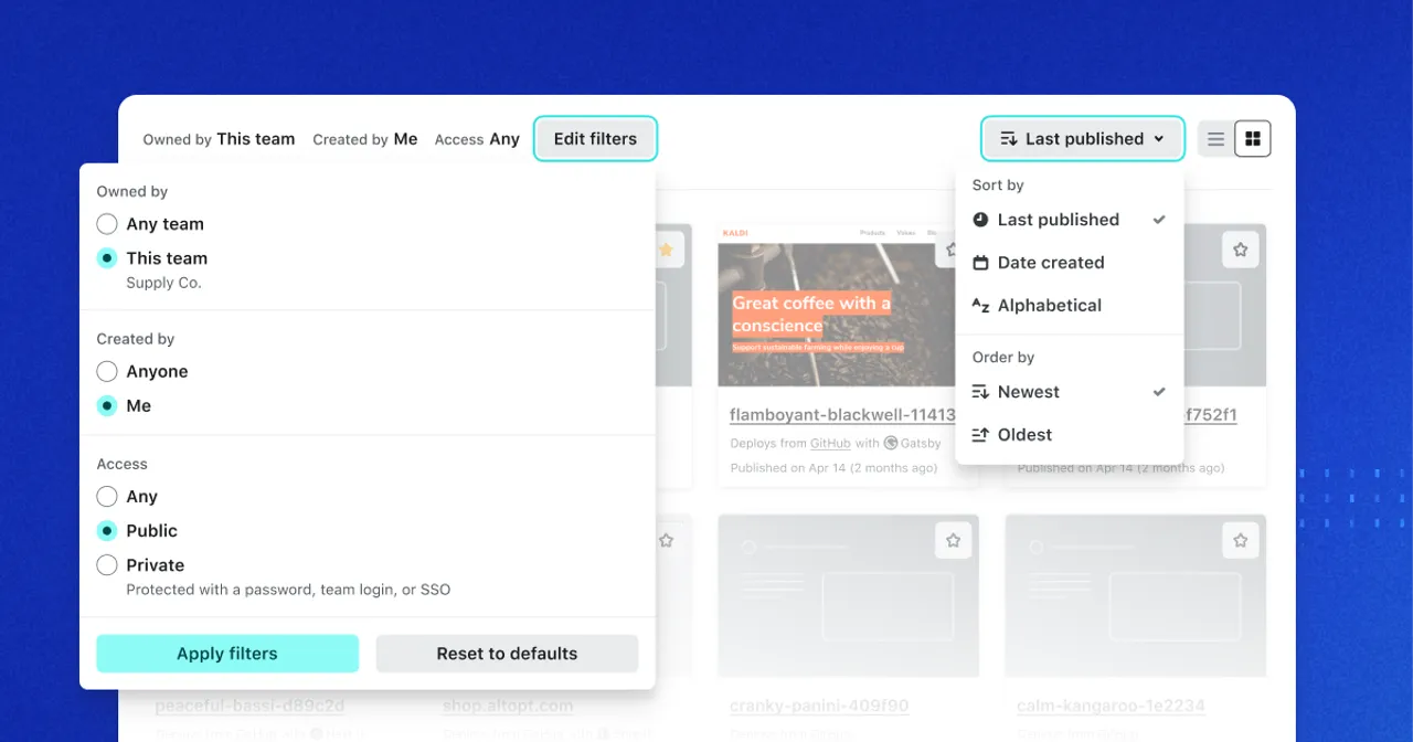 If your team has a lot of sites on Netlify, you might sometimes find it tricky to track down exactly which site you need. To help you find your sites faster, we’ve added sorts and filters to the Sites list.
